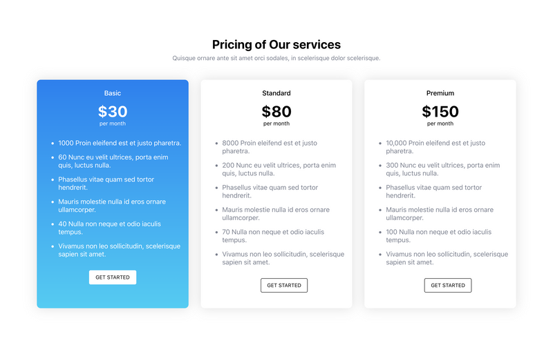 Free Simple three tier pricing section UI snippet made with HTML, Css, and Js to customize your websites.